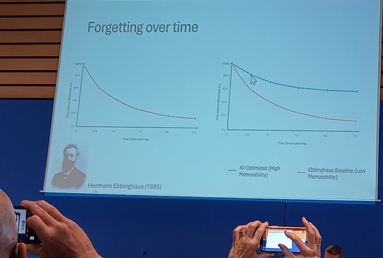 The model he developed predicts which text will be more easily remembered and works on using AI to adjust it. Principles to make images and text more memorable are sometimes obvious, sometimes not. In many of his tests, the most memorable image (for both men and women) was of a ‘Bikini’. Training AI on large-scale memory data has great potential for predication and generation of high impact content to complement learning strategies. I found it a fascinating presentation and encourage you to follow Thomas’ work.