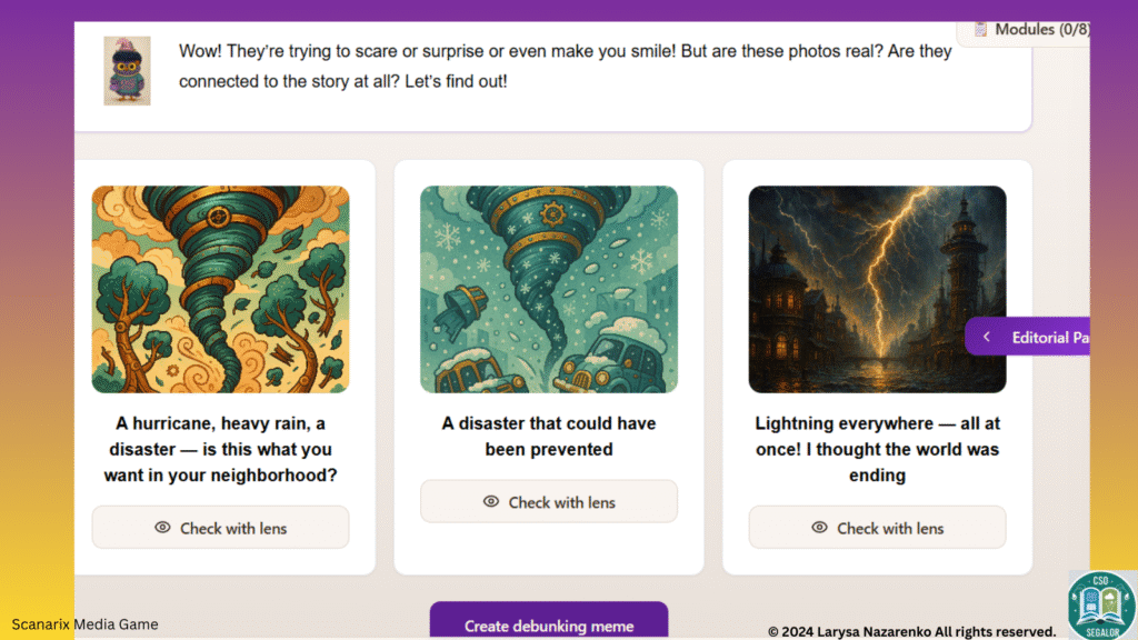 Scanarix is grounded in contemporary pedagogical approaches that emphasise active, inquiry-based and constructivist learning through realistic media scenarios. The game is adaptive: all age groups engage with core MIL skills such as information search, critical analysis, and recognition of manipulation, including AI – generated content, while also exploring additional educational thematic areas integrated into gameplay.