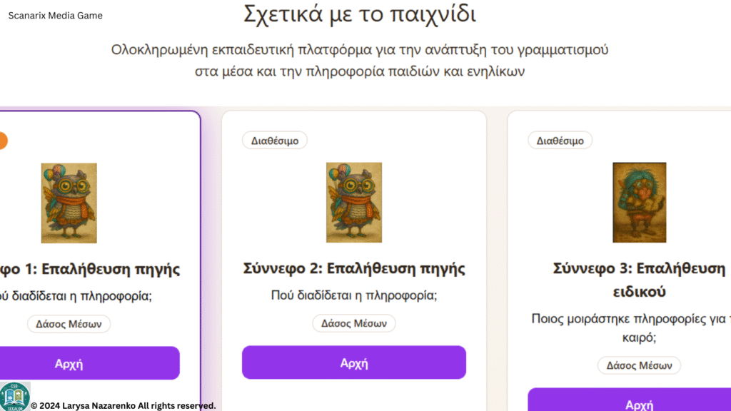 foster critical MIL awareness. It is available as both an offline quest-based game with board game elements and a web-based interactive game (demo version). Currently in English, Ukrainian, and Greek, Scanarix is designed for inclusive, cross-cultural learning, with more languages on the way.