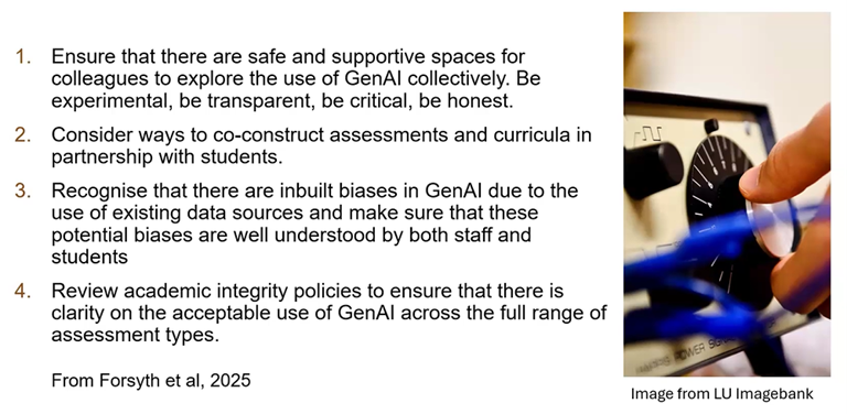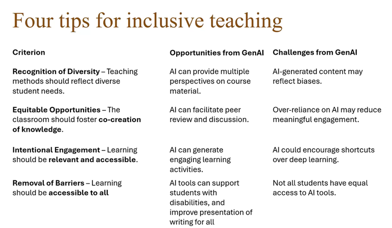 GenAI can be used to help you with these tips for inclusive teaching. However, you should be aware that the use of GenAI comes with challenges. Rachel lists the four teaching tips, the opportunities from GenAI, and its challenges: