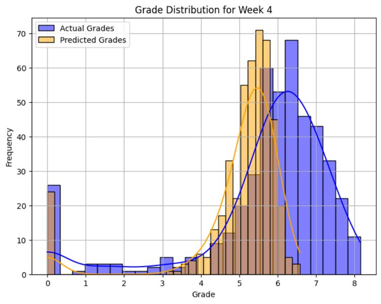 Our tool uses a two-stage model to predict grades. First, it identifies students at risk of receiving a zero (for example, dropouts or no-shows) by detecting patterns across a complex mix of online activities, correctly identifying 95% of these cases. Then, for students engaging with the course, the model predicts their final grade based on many combined signals, such as quiz and video interactions. Compared to randomly guessing the average grade of last year’s cohort for every student in the new cohort, our model is more accurate throughout the semester, particularly around the mid-semester point, correctly predicting grades within one grade point for 62% of students. As expected, the early weeks are less precise due to limited data, but this foundation can be improved with tweaks.