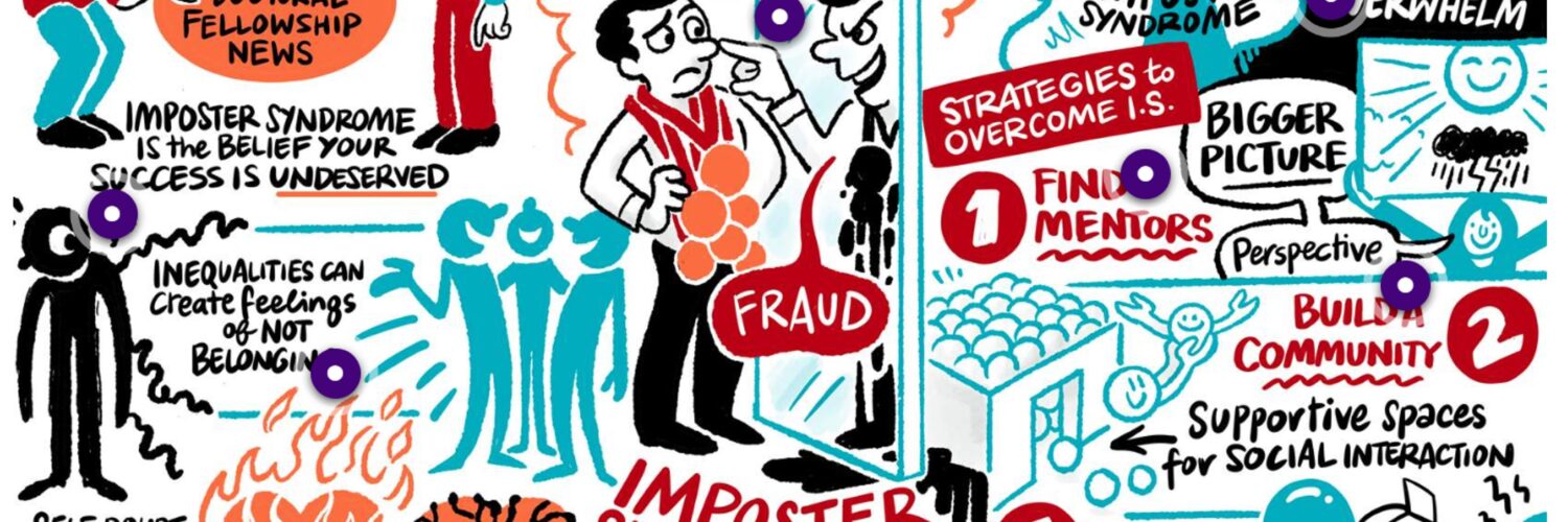 Figure 2. The visual presents the core learning material designed to provide information on the topic ‘Confidence and Impostor Syndrome’. It features a scribe created by independent artist James Baylay, explaining how this challenge can affect wellbeing (left side) and offering strategies to address and overcome it. The hotspots offer additional information related to this topic.