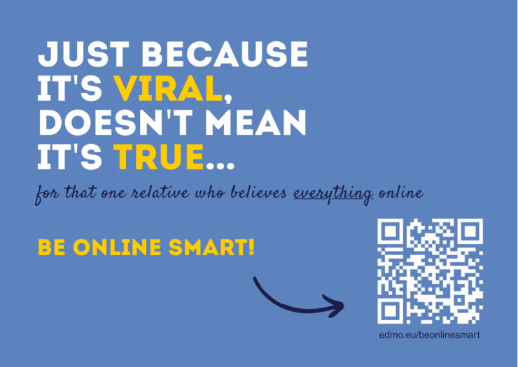 “Be Online Smart” is an offline campaign, with postcards, posters, and stickers distributed across all 27 EU member states by EDMO’s 14 national and regional hubs from 12 May until 30 May. These materials will raise awareness in schools, libraries, community centres and other public spaces.
